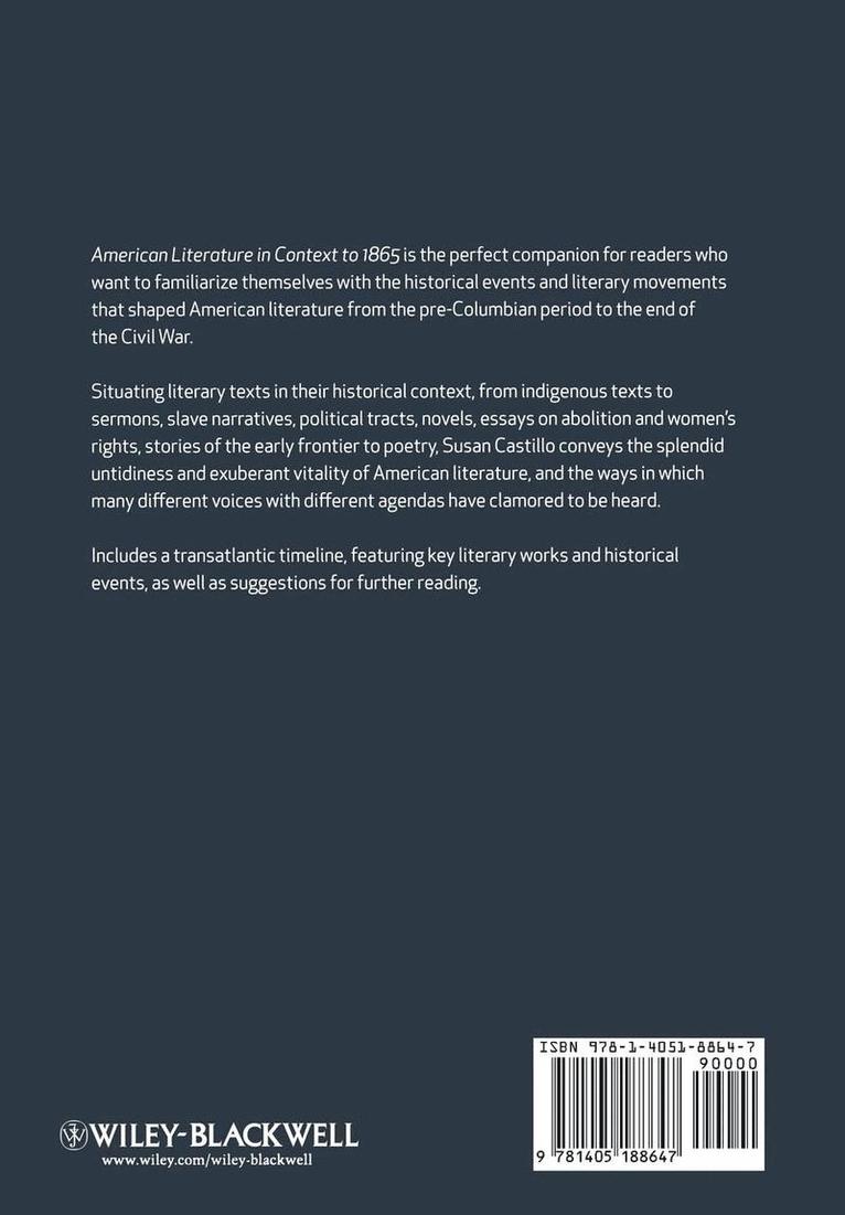 American Literature in Context to 1865 discusses the issues and events that engaged American writers of the period, providing original and useful readings of important literary works that demonstrate how context contributes to meaning Covers a range of genres including the myths, chants and songs of indigenous cultures, sermons, slave narratives, essays and the novels and poetry to 1865Designed to be used alongside the major anthologies of literature from the periodEquips students with the necessary historical context needed to understand the writings from this periodPedagogical features include a detailed bibliography, and a transatlantic timeline, with literary works, and historical events