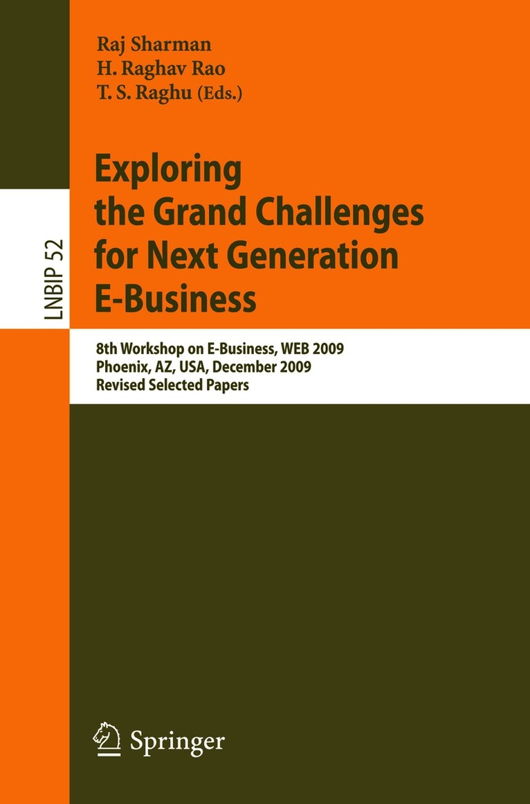 This book is based on a selection of thoroughly revised and extended best papers from the 8th Workshop on E-Business (WEB 2009) held in Phoenix, AZ, USA, on December 15th, 2009. The 29 papers, which were selected from 70 presentations at the workshop, highlight the enormous developments and potential of e-business at a time when new technologies like cloud computing, collective intelligence, and multi-sided platforms are burgeoning. Among the topics covered are Web-based information systems, RFID and supply chain management, process modeling and standardization, security and privacy issues, social networking and mobility, e-services and market mechanisms, IT portfolio management, and other special topics in e-business such as electronic invoicing.