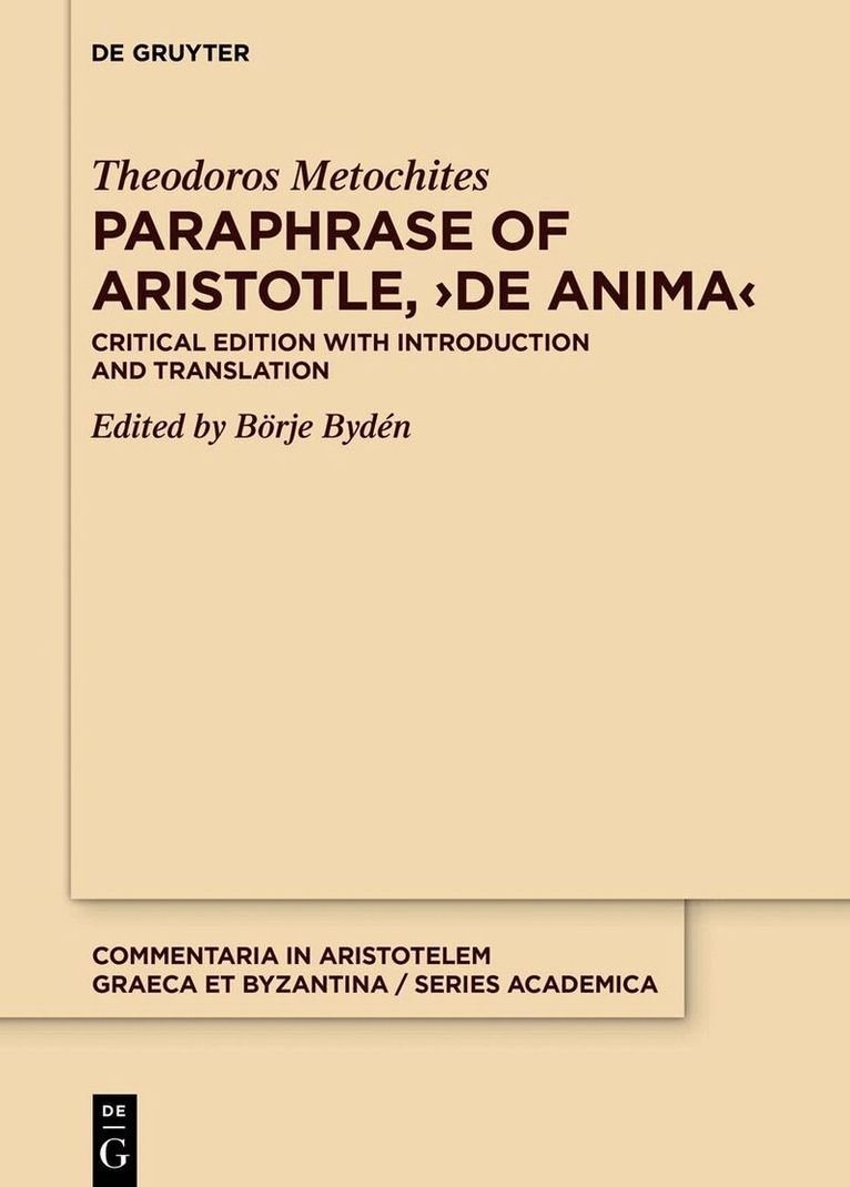 Theodore Metochites’ Aristotelian paraphrases (c. 1312), covering all 40 books of the Stagirite’s extant works on natural philosophy, constitute one of the major achievements of late Byzantine learning. This volume offers the first critical edition of Metochites’ paraphrases of the three books of the De anima, accompanied by an introduction and an English translation with an apparatus of parallel passages in Aristotle’s ancient commentators. The first part of the introduction presents and evaluates the sources for the text, consisting of thirteen Greek manuscripts, a 15th-century Greek epitome and a 16th-century Latin translation. The genealogical relationships between these are established on the basis of separative and conjunctive errors, identified, inter alia, through critical discussions of more than 300 passages. The second part of the introduction discusses the nature, purpose and sources of the paraphrases as well as several linguistic questions with implications for editing and translating the text. The third part of the introduction sets out the principles of this edition and translation.