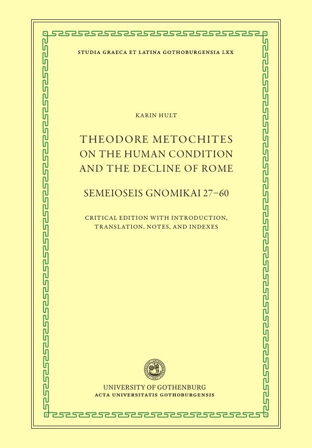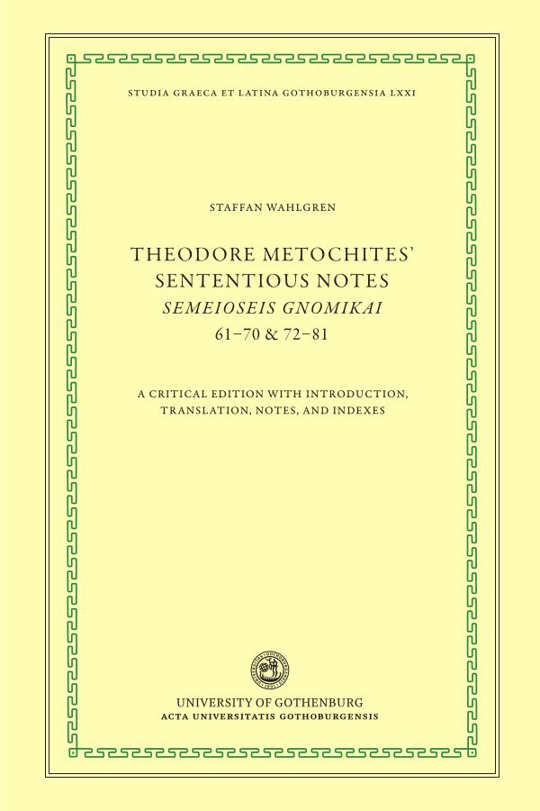 A critical edition, with English translation and notes, of chapters 27–60 of the Semeioseis gnomikai (“Sententious notes”), a collection of 120 essays by the Byzantine statesman and scholar Theodore Metochites (1270–1332). The edition is based on three manuscripts, which are briefly presented in the introduction. P (Par. gr. 2003, Paris) and M (Marc. gr. 532, Venice) were both written in the early fourteenth century; E (Scor. gr. 248, Escorial) is a sixteenth-century copy of M. After the edition, with accompanying English translation and notes, the book is concluded with a bibliography and three indexes: of quoted passages, Greek words, and Greek names. Several of the essays in this volume contain laments on the reduced state of the Eastern Roman Empire (Byzantium), and on the vicissitudes of human life and fortune. A group of short essays describe the pleasure of beholding Creation and one of the longest discusses the pros and cons of having been born, i.e. of life.