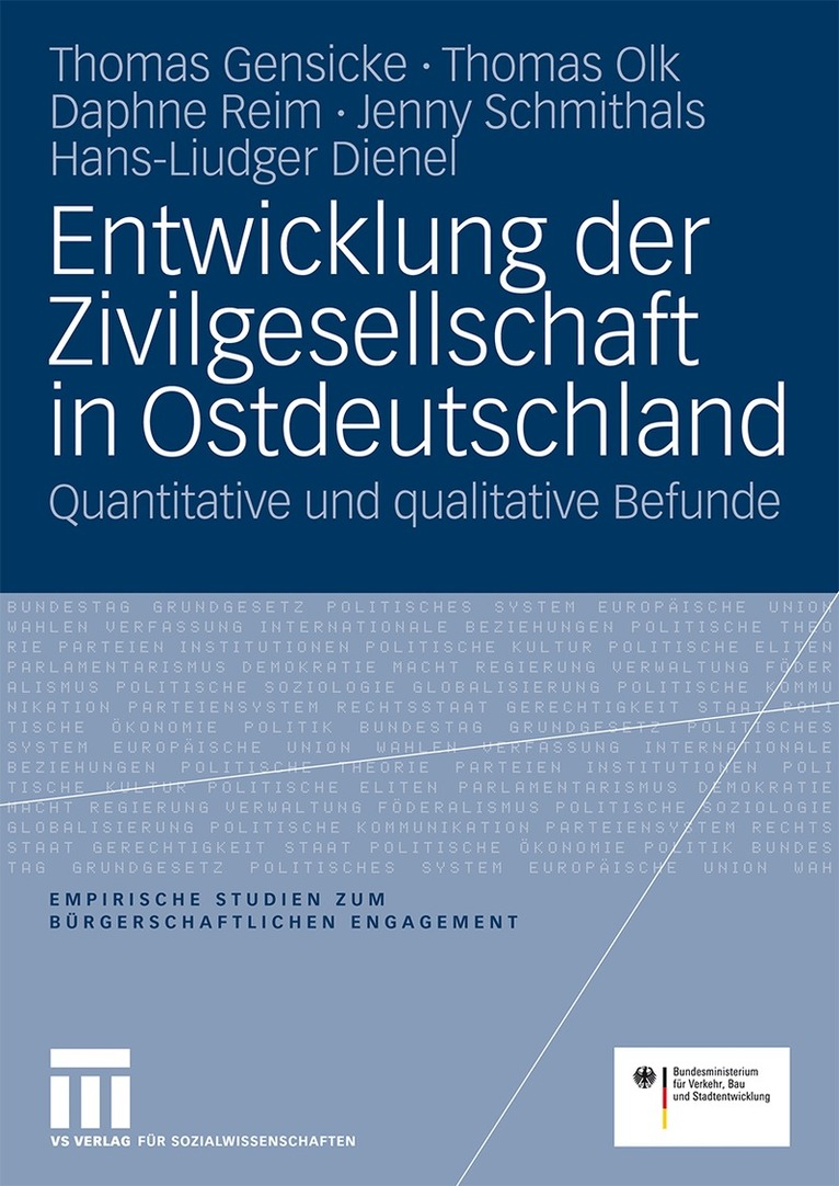 Die Studie wurde im Auftrag des Bundesministeriums des Innern (BMI) bereits zum zweiten Mal durchgeführt. Basis sind die Daten des Freiwilligensurveys und vertiefende Interviews mit Akteurinnen und Akteuren, die auf der örtlichen bzw. regionalen Ebene mit der Förderung des bürgerschaftlichen Engagements betraut sind. Chancen und Probleme im Bereich der Zivilgesellschaft in den neuen Bundesländern werden vergleichend mit den alten Ländern und im Vergleich der neuen Länder untereinander systematisch analysiert.