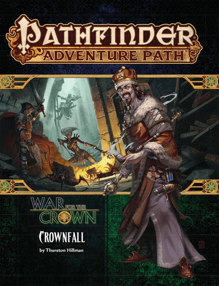 As the entire capital city gathers to celebrate, conspiracy and stagnation rot the old empire of Taldor to its core! When a high-minded cabal of Senators and nobles try to steer their nation away from disaster, Emperor Stavian III himself orders a bloodbath in the Senate halls, trapping neophyte spies inside layer upon layer of magical security. As tensions rise and the emperor falls, can the heroes escape the forgotten halls beneath the Senate and save the heir to Taldor from an assassin’s blade? And even then, can anyone prevent a civil war that will tear the Inner Sea’s oldest nation apart at its rotting seams?“Crownfall” is a Pathfinder Roleplaying Game adventure for 1st-level characters. The adventure kicks off the War for the Crown Adventure Path, as players drag a once-grand nation kicking and screaming into the modern day, becoming legendary politicians, spymasters, and nobles in their own right. A selection of new monsters, a city gazetteer of Taldor’s capital Oppara, a look at magical relics and the power they conceal, and an overview of the campaign round out this volume of the Pathfinder Adventure Path.Each monthly full-color softcover Pathfinder Adventure Path volume contains an in-depth adventure scenario, stats for several new monsters, and support articles meant to give Game Masters additional material to expand their campaign. Pathfinder Adventure Path volumes use the Open Game License and work with both the Pathfinder RPG and the world’s oldest fantasy RPG.