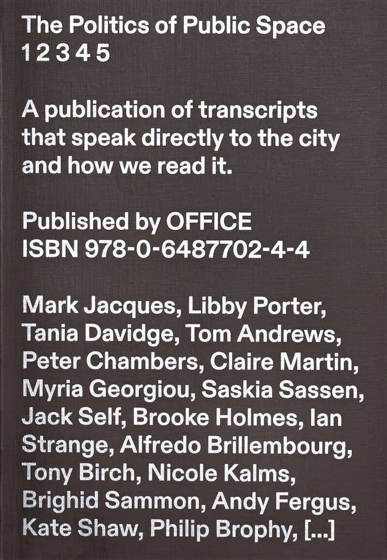 The Politics of Public Space Volume Five collates the all four previously sold out volumes along with nine new conversations with; Gary Foley, Alison Young, Lily Éire Parsons, Uncle Dave Wandin, Wendy Steele, Polly Stanton, Kelsie Nabben, Olivia Daw, Genevieve Quinn, Lewis Orgar, and Carroll Go-Sam. The Politics of Public Space began in 2018 as a public lecture series curated by OFFICE. These discussions took place outside the conventional spaces of the university, held on Melbourne’s street corners, laneways, parks, shopping strips and plazas. Meeting in different locations around the city allowed these perspectives to be directed at the city’s forms and the issues at stake in their development. The project evolved from a series of short talks and interviews to the release of four volumes of transcripts that capture the perspectives of 39 speakers. These diverse opinions demonstrate the distinct and often contradictory views on what public space is, how we occupy it and how it should be designed and governed. The previous four volumes of The Politics of Public Space set out to reveal the growing inequality within cities, and we hope these additional nine texts identify ways forward to more equitable public spaces. These range from the inclusion of diverse and marginalised communities in planning and design, to the combination of bottom-up approaches and top-down policy to enact change. This new volume expands on these ideas and approaches, to advocate for better outcomes in the built environment that consider environmental, social, economic and culturally equitable experiences in public spaces. Across all of the volumes of The Politics of Public Space, we have sought new ways to communicate the critical value of public spaces: both for shaping how we live now, and in informing just and equitable futures. We hope that this collection of texts adds to the growing discourse around public space and becomes an ongoing resource to those interested in the city and the forces that shape it.