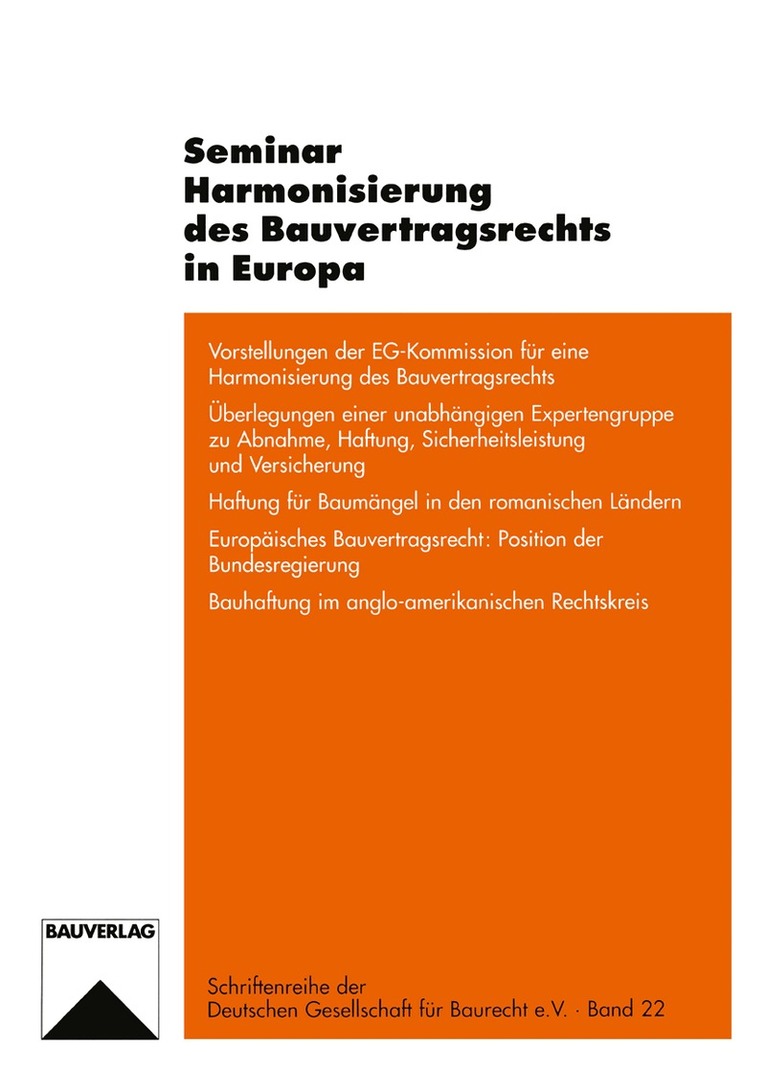 Die Harmonisierung bzw. "Europaisierung" von Gesetzen und Verordnungen auf dem Gebiet des Bauvertragsrechts fuhrt zu zahlreichen Anderungen gewohnter Regelungen und sorgt damit fur Unsicherheit bei den Betroffenen. Dies war Anlass fur die Deutsche Gesellschaft fur Baurecht e.V., ein Seminar zu veranstalten, das die Verpflichtungen, die den EG-Mitgliedstaaten in diesem Bereich zur Verwirklichung des europaischen Binnenmarktes auferlegt sind, behandelte. Alle Beitrage werden in diesem Sammelband veroffentlicht.