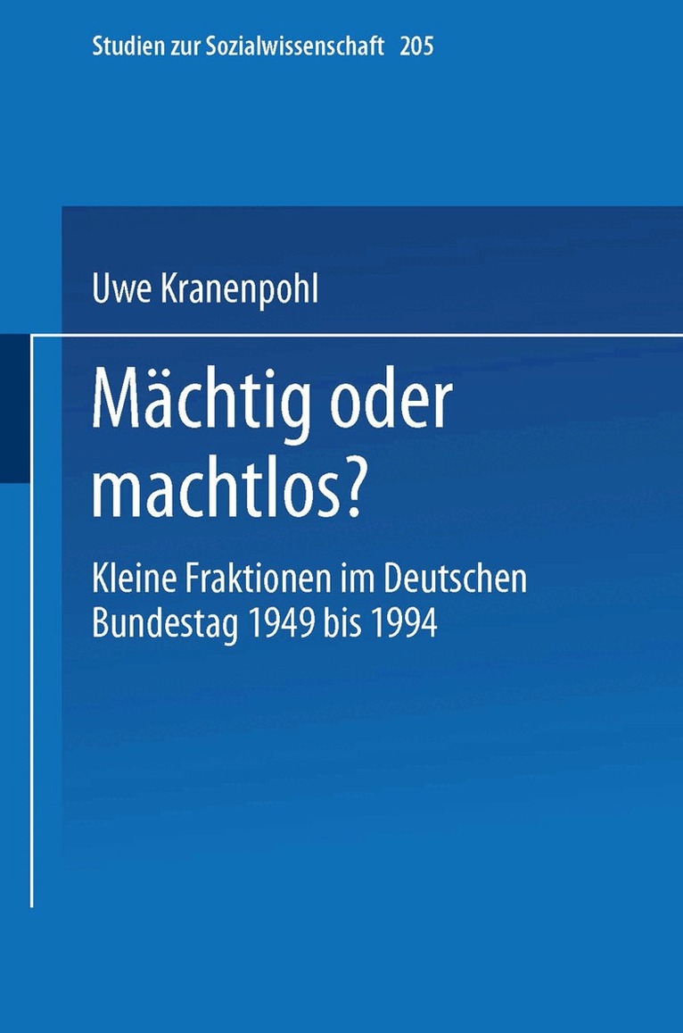 Bei der vorliegenden Studie handelt es sich um die leicht gekürzte Fassung einer an der Philo sophischen Fakultät der Universität Passau eingereichten Dissertation. Das Prüfungsverfah ren wurde am 15. Dezember 1997 abgeschlossen. Die Konsequenzen eines erfolgreichen Promotionsverfahrens sind vieifliltig. Hingewiesen sei hier nur auf die juristischen Folgen, die der Erhalt des- in Deutschland meist nur virtuel len - Doktorhutes für den frisch Promovierten im Melde- oder im Besoldungsrecht hat bzw. 1 haben kann. Zugleich soll eine Dissertation aber auch neue Erkenntnisse zu Tage fOrdern und somit dem wissenschaftlichen Fortschritt dienen. So korrekt es ist, daß der Forscher für seine Studie verantwortlich zeichnet und sich somit alle ihre Schwächen, Ungenauigkeiten und Fehler zurechnen lassen muß, so zutreffend ist es gleichwohl, daß er allein oft nichts -oder deutlich weniger gutes - zustande brächte. So ist es auch mir Pflicht und Ehre, auf jene hin zuweisen, ohne deren Mithilfe die Arbeit der Kleinfraktionen im Deutschen Bundestag immer noch unerforscht wäre.