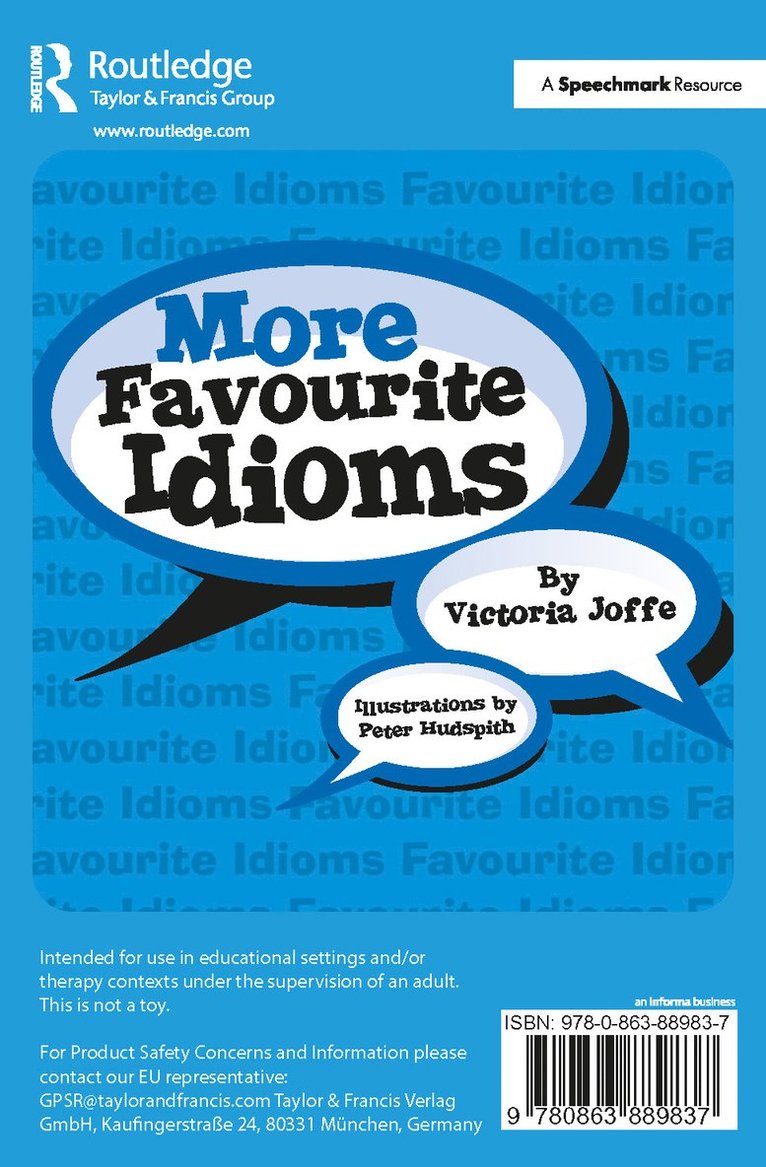 Do you 'see red' when people use phrases you don't understand. Or maybe get 'cold feet' because you are feeling 'under the weather'? For those on the autism spectrum or when English isn't their first language, these every day phrases are completely baffling. These sets of cards humorously depict well known idioms and the accompanying detailed booklet provides a dictionary meaning for each card, and a range of ideas and activities for use. 36 cards per pack and accompanying booklet Suitable for all ages Dr Victoria Joffe is a specialist speech and language therapist and senior lecturer in developmental speech, language and communication impairments in the Department of Language and Communication Science at City University, London. She is also programme director of an innovative MSc degree in Joint Professional Practice: Language and Communication, run in conjunction with the Institute of Education.Intended for use in educational settings and/or therapy contexts under the supervision of an adult. This is not a toy.