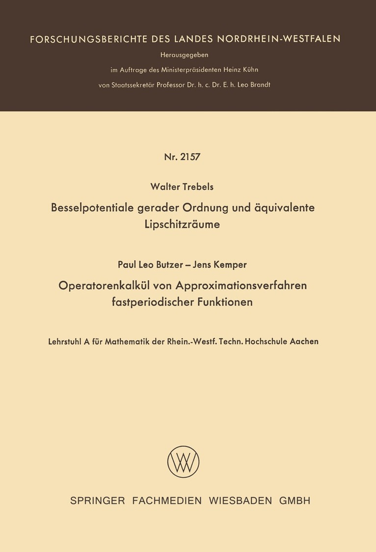 Diese Monographie behandelt die eindimensionale Hilberttransformation und die ge brochene Integration auf der reellen Zahlengeraden. Da sich viele der Beweise auf die Fouriertransformation für Lp-Funktionen (1 ~ P ~ 2) stützen, haben wir in Kapitel 1 alles Nötige aus der Theorie der Fouriertransformation für Funktionen einer Veränder lichen systematisch zusammengestellt. Weiterhin haben wir uns erlaubt, die wohl bekannten Eigenschaften der Hilberttransformation ohne Beweis vorauszusetzen und weniger bekannte ausführlich zu beweisen. Der Schwerpunkt der Monographie liegt bei den Kapiteln 3-6, deren Ergebnisse zum großen Teil neu sind. Da in der Einleitung über die Problemstellung und über die Resultate näher berichtet wird, sei an dieser Stelle nur erwähnt, daß Ausgangspunkte unserer Überlegungen Arbeiten folgender Mathematiker sind: S. BOCHNER, J. L. B. COOPER, W. FELLER, G. H. HARDY, J. E. LITTLEWOOD, G. O. OKIKIOLU, M. RIESZ, E. C. TITCHMARSH und H. WEYL. Dadurch wird eine Einordnung unserer Ergebnisse gewährleistet. Unser besonderer Dank gilt Herrn Professor J. L. B. COOPER für viele fruchtbare Dis kussionen und wertvolle Ratschläge. Seine Vorträge im Aachener Kolloquium und seine Teilnahme an einer Tagung, die der erstgenannte Verfasser im MATHEMATISCHEN FORSCHUNGSINSTITUT OBERWOLFACH im August 1963 abgehalten hat, waren stets an regend. Die Verfasser danken den Herrn Dr. E. GÖRLICH und H. JOHNEN für manche kritischen Bemerkungen und für ihre Mithilfe bei der Durchsicht von Teilen des Manuskripts und der Korrekturen, ferner Frl. K. REIMER-KELLNER, die das Manuskript mit großer Sorgfalt geschrieben hat, und dem Westdeutschen Verlag für sein Ent gegenkommen und die gute Ausstattung dieser Monographie.
