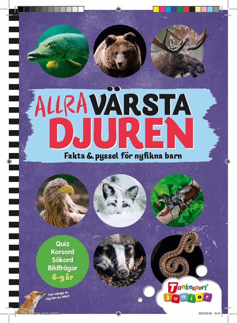Rekorddjur : snabbast på land, snabbast i luften, minsta djuret, största djuret, största bajset, farligaste, giftigaste, bästa synen, bästa kamouflaget, etc - minifakta om det värsta med djuret, kors-ord/ordpyssel, sökord, krisskross på tema djur, Quiz, bildfrågor, räkna, mät, jämför, finn fem fel etc. Fin grafisk form, foton som illustrerar.