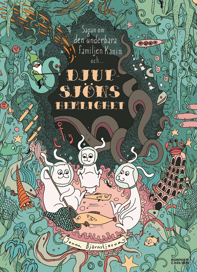 Lillebror Kanin tycker inte om att bada. Särskilt inte i Djupsjön för den ser så läskig ut. Men han vill ändå vara med när Storasyster och Storebror är "fisk-skådare" just där. "Akta dig för Sjöodjuret!" hojtar Storebror plötsligt så Lillebror måste kasta sig upp ur vattnet. Men Storebror luras bara, så när han och Storasyster fortsätter att hojta om Sjöodjuret vänder Lillebror bara ryggen till. Då blir det dödstyst bakom honom. Och när han vänder sig om är syskonen borta. Vart tog de vägen? Tänk om de är i fara! I sådana fall är det bara Lillebror som kan rädda dem, trots att sjön är så djup och full av läbbiga fiskar ...Jonna Björnstjernas smått surrealistiska rysmysiga äventyr har röstats fram av Bokjuryn som årets bästa bilderbok två gånger: Sagan om den underbara familjen Kanin och monstret i skogen prisades 2007 och Godistrollet 2010. Läs mer: www.familjenkanin.com.