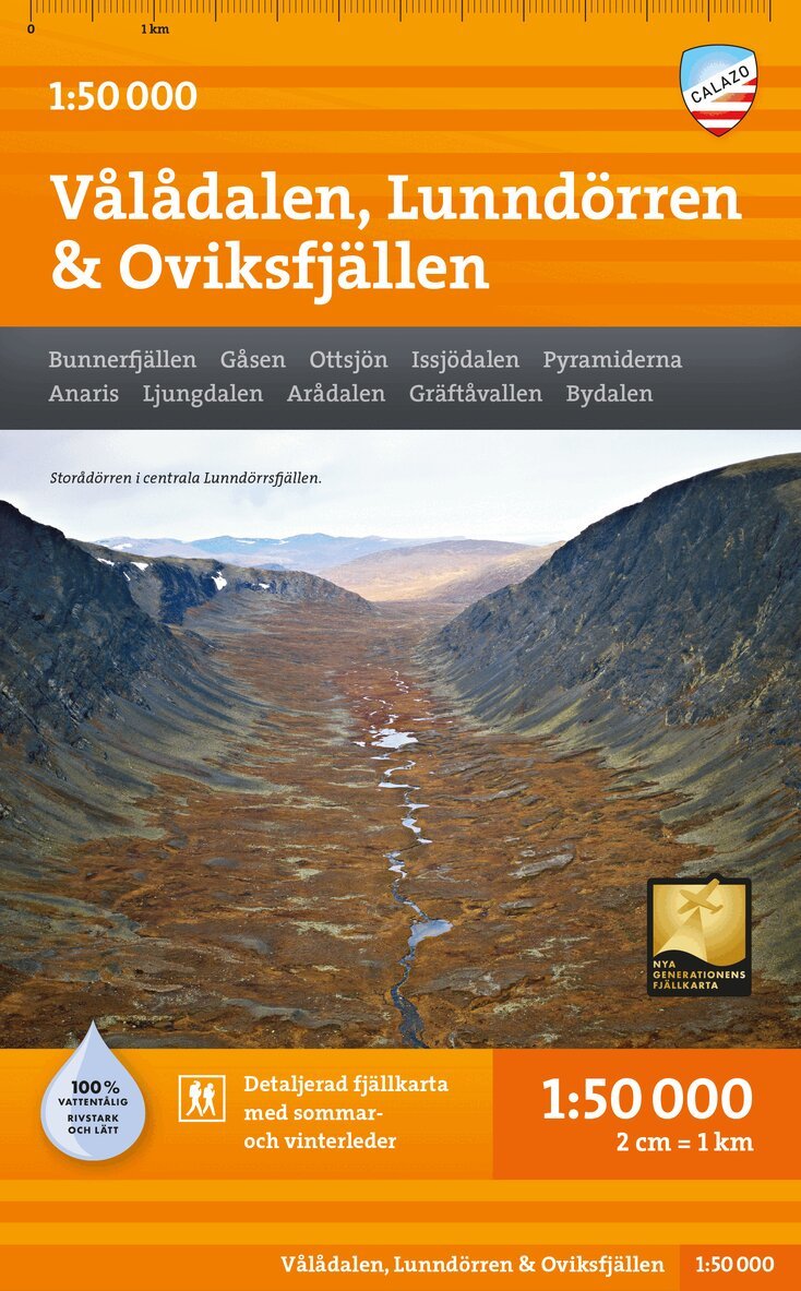 Den specifika fjällinformationen visar bland annat markerade sommar- och vinterleder, färdvägar lämpliga för skoteråkning, broar och vad, fjällstationer, raststugor, hjälptelefoner och mycket mer.Kartan är tryckt på Polyart som är helt vattentåligt, den håller även för många vikningar och tuffa tag. Kartans innehåll, tydlighet och hållbarhet gör den idealisk att ta med på turen. Kartan är tryckt på båda sidor, skala 1:75 000. Teckenförklaring på svenska, engelska och tyska.