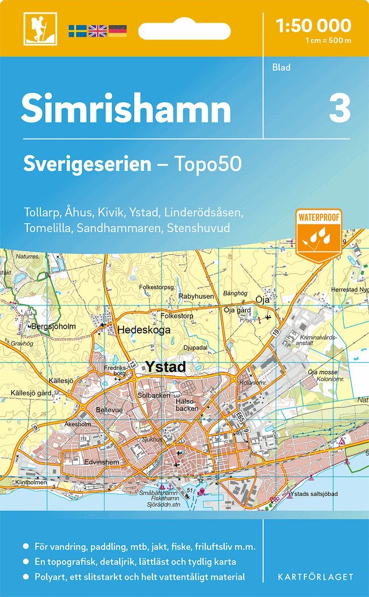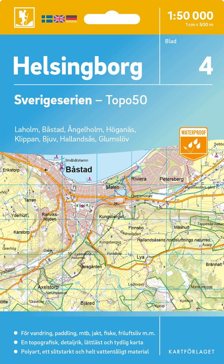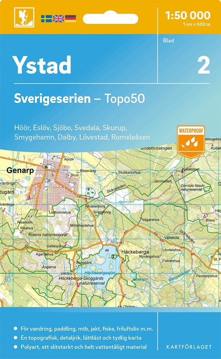 Sverigeseriens friluftskartor är en serie om 116 kartor med ett täckningsområde som sträcker sig över södra och mellersta Sverige samt Norrlandskusten. Det är kartan för dig som söker information inför friluftsaktiviteter som vandring, utflykter, traillöpning, jakt, fiske, ridning, cykling, mtb, paddling, långfärdsskridsko m.m.De topografiska kartorna i skala 1:50 000 innehåller all den information som förväntas av en terrängkarta för friluftsliv: terränginformation, vandringsleder, motionsspår, camping, vindskydd, golfbanor, badplatser, fornlämningar, vägar graderade i olika klasser, järnvägslinjer och mycket mer.Topografin är lätt att läsa med höjdkurvor i intervaller om 5 meter. Tillsammans med redovisning av olika marktyper och natur syns miljön tydligt. Här visas bland annat olika typer av skog, öppen eller odlad mark, berg, sankmark, sjöar, vattendrag, vägar, leder och stigar. Högre byggnader som vindkraftverk, kraftledningar, master och torn är bra symboler på kartan att använda som riktmärken i naturen vid navigering.Sverigeserien är en kvalitetskarta som är gjord för att användas! Aktuellt kartdata är hämtat från Lantmäteriet och den är tryckt på Polyart som är helt vattentåligt och slitstarkt. Det mjuka materialet tål att vikas om och om igen. Den klarar både vinterns och sommarens ibland utmanande väder i Sverige. Kartorna har en utförlig teckenförklaring på svenska, engelska och tyska.