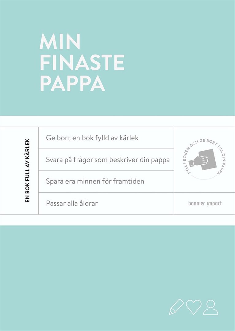 Du älskar din pappa, men hur ska du säga det till honom? Med denna fyll-i-bok får du lösningen. Djupa, roliga och känslomässiga frågor hjälper dig att formulera det som är svårt att klä i ord. Som ett färdigt album är denna bok en vacker kärleksförklaring. Kanske till Fars dag, pappas födelsedag eller julafton, eller bara som en oväntad överraskning!