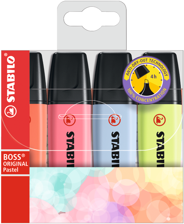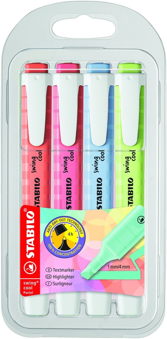 STABILO swing cool är en av marknadens mest sålda "passar-i-fickan"överstrykningspennor. Perfekt för studenter och de som har en mobil arbetsplats, eftersom korken har liten klämma som kan fästas i fickan. Pennkroppen har en greppvänlig yta. STABILO swing cool har har 4 timmars "cap off tid". Två skrivbredder: 1 + 4 mm. Här i 4 pastellfärger