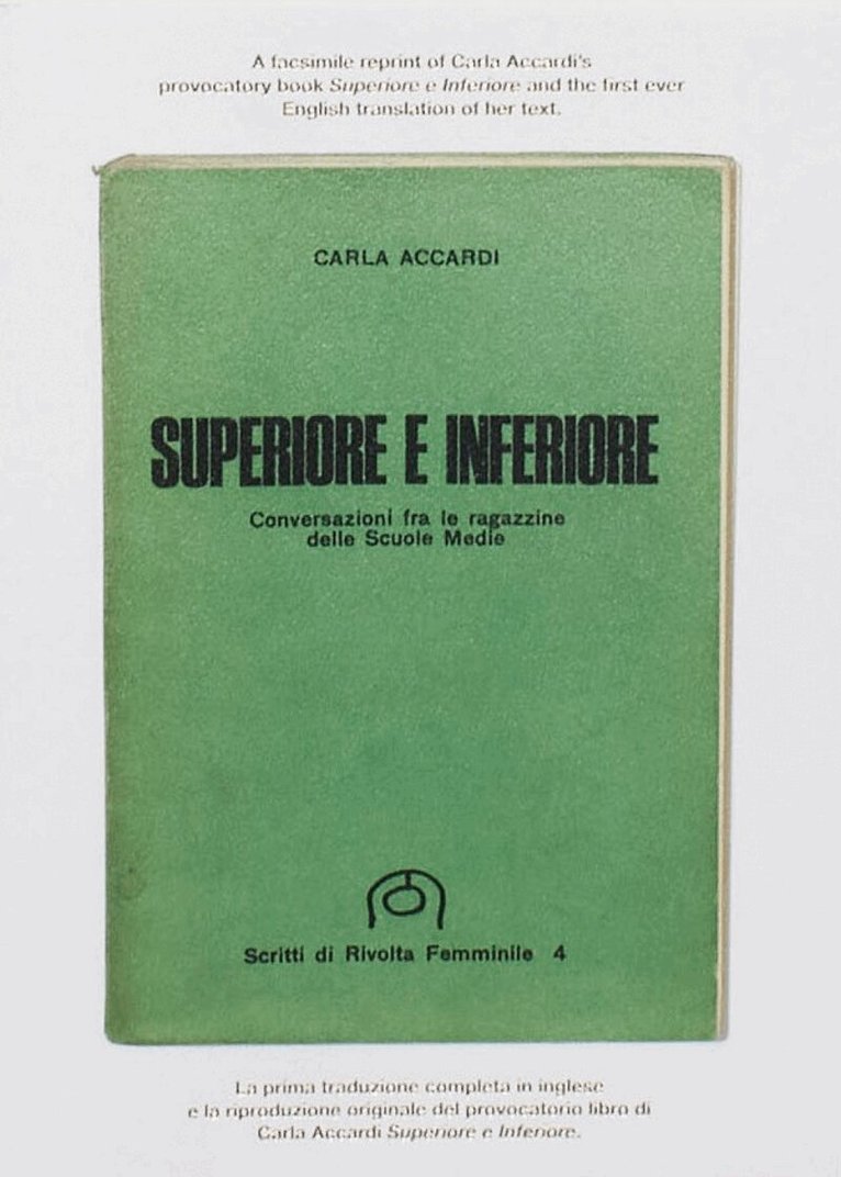 The book Superior and Inferior presents a facsimile reprint of Carla Accardi’s provocatory publication Superiore e Inferioreand the first ever English translation of the full text.First published in 1972 by Italian abstract artist and feminist Carla Accardi (1924–2014), the book Superiore e Inferiorefeatures discussions among girls at a middle school – all between 10 and 13 – about society’s discriminatory behaviourtowards women. They also commented the Manifesto of the revolutionary feminist group Rivolta Femminile – collectivelywritten by Accardi, art critic and feminist activist Carla Lonzi, and Elvira Banotti – which first appeared posted on city wallsin Rome in July 1970. For having discussed sex-related issues with pupils, Accardi was fired and permanently suspended from teaching. (Herletter of dismissal issued by the Italian Ministry of Education forms part of the introduction to the book.)Along the lines of Pasolini’s Comizi d’Amore (Love Meetings), Accardi’s own voice is secondary in the book, giving way tothe thoughts, narratives, opinions, and debates expressed among girls on the role of women and girls, family conflicts andintimate relations.
