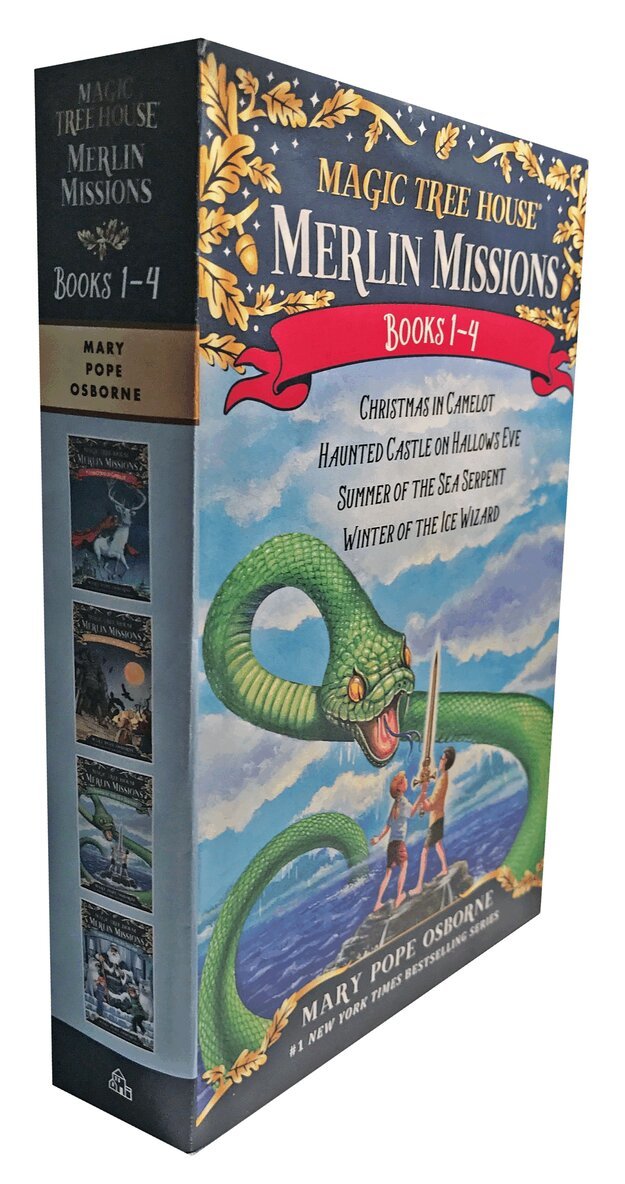 The great wizard Merlin has missions for Jack and Annie! It's a boxed set of Merlin Mission Books 1-4 in the #1 New York Times bestselling Magic Tree House series--let the magic and adventure begin!Beyond the realms of time and space are lands that exist only in myths and legends. This is where the magic tree house is taking Jack and Annie on the quest of a lifetime! They will visit Camelot, a haunted castle, an island lost in mist, and the Land-Behind-the-Clouds. It is four books and one unforgettable adventure!The first 4 Magic Tree House Merlin Mission paperbacks all in one box are the perfect gift for fans of the Magic Tree House series. Parents, teachers, and librarians hail the chapter-book series for creating a lifelong love of reading. Every kid will want to know where the magic tree house takes the brother-and-sister team next!Magic Tree House Merlin Missions are more challenging adventures for the experienced Magic Tree House reader.Books in this boxed set include: Christmas in Camelot (#1), Haunted Castle on Hallows Eve (#2), Summer of the Sea Serpent (#3), Winter of the Ice Wizard (#4).