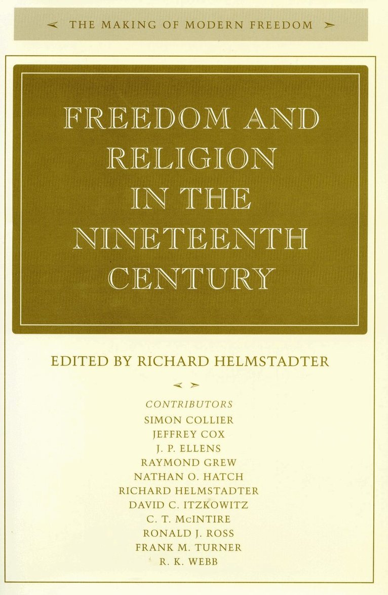 The subject of religious liberty in the nineteenth century has been defined by a liberal narrative that has prevailed since Mill and Macaulay to Trevelyan and Commager, to name only a few philosophers and historians who wrote in English. Underlying this narrative is a noble dream—liberty for every person, guaranteed by democratic states that promote social progress though not interfering with those broadly defined areas of life, including religion, that are properly the preserve of free individuals.At the end of the twentieth century, however, it becomes clear that religious liberty requires a more comprehensive, subtle, and complex definition than the liberal tradition affords, one that confronts such questions as gender, ethnicity, and the distinction between individual and corporate liberty. None of the authors in this volume finds the familiar liberal narrative an adequate interpretive context for understanding his particular subject. Some address the liberal tradition directly and propose modified versions; others approach it implicitly. All revise it, and all revise in ways that echo across the chapters.The topics covered are religious liberty in early America (Nathan O. Hatch), science and religious freedom (Frank M. Turner), the conflicting ideas of religious freedom in early Victorian England (J. P. Ellens), the arguments over theological innovation in the England of the 1860's (R. K. Webb), European Jews and the limits of religious freedom (David C. Itzkowitz), restrictions and controls on the practice of religion in Bismarck's Germany (Ronald J. Ross), the Catholic Church in nineteenth-century Europe (Raymond Grew), religious liberty in France, 1787-1908 (C. T. McIntyre), clericalism and anticlericalism in Chile, 1820-1920 (Simon Collier), and religion and imperialism in nineteenth-century Britain (Jeffrey Cox).