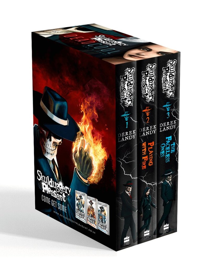 Books 1, 2 and 3 in the Skulduggery Pleasant – the biggest, funniest, most thrilling comedy-horror-adventure series in the universe! From number-one-bestselling author Derek Landy.Book 1: SKULDUGGERY PLEASANT. Meet Skulduggery Pleasant: detective, sorcerer, warrior. Oh yes, and dead.Book 2: PLAYING WITH FIRE. Vengeous. Dusk. Sanguine. Three of the deadliest killers alive are in town to resurrect an unstoppable creature of horrifying power… and only Skulduggery and Valkyrie stand in their way.Book 3: THE FACELESS ONES. You’ve seen it all before: some bad guy wants to bring about the end of the world. A few people get hurt, sure, but everything’s all right in the end. Well… not this time.