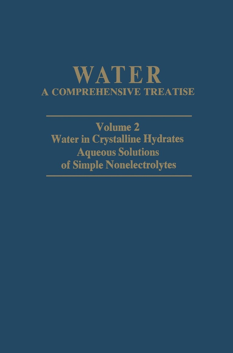 Since the publication of the previous volumes many new aspects of the physical and life sciences have been developed in which the properties of water play a dominant role. Although, according to its preface, Volume 5 was to be the last one of the treatise, these recent developments have led to a revision of that statement. The present volume and its companion, still in preparation, deal with topics that were already mentioned in the preface to Volume 5 as gaining in importance. The recent development of X-ray and, more particularly, neutron scattering techniques have led to studies of "structure" in aqueous solutions of electrolytes on the one hand, and to the role of water in protein structure and function on the other. Both these topics have reached a stage where reviews of the present state of knowledge are useful. The application of ab initio methods to calculations of hydration and conformation of small molecules has a longer history, but here again a critical summary is timely. The role of solvent effects in reaction kinetics and mechanisms should have had a place in Volume 2 of this treatise, but, as sometimes happens, the author who had taken on this task failed tQ live up to his promise. However, since 1972 the physical chemistry of mixed aqueous solvents has made considerable strides, so that the belated discussion of this topic (by a new author) is built on evidence that was not available at the time of publication of Volume 2.